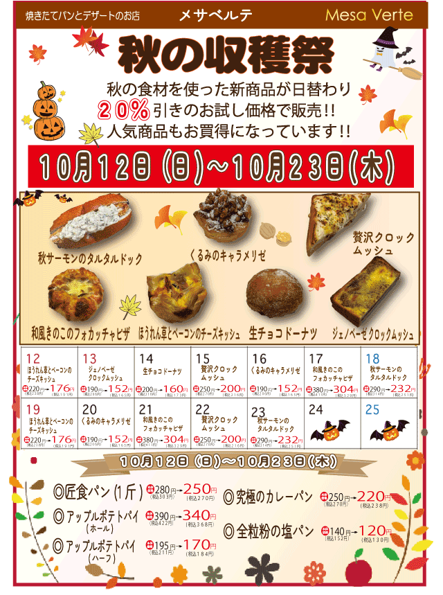 2025.10.08 秋の収穫祭のお知らせ 10月12日(日)~10月23日(木)は秋の収穫祭を開催いたします!(^^)! 秋の食材を使った新商品が日替わりで20%引きのお試し価格で販売します(^^♪ この機会に是非ご賞味ください♪